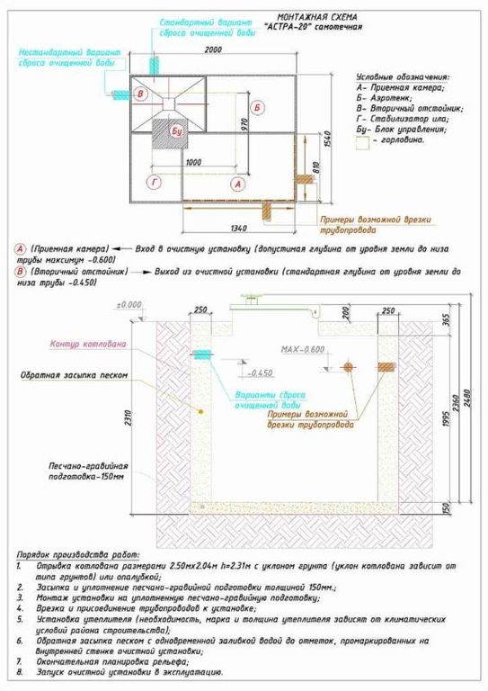 При варианте отведения очищенной воды самотеком габаритный размер станций по одной из сторон увеличивается на 90 мм из–за патрубка выходящей трубы (согласно монтажной схеме).